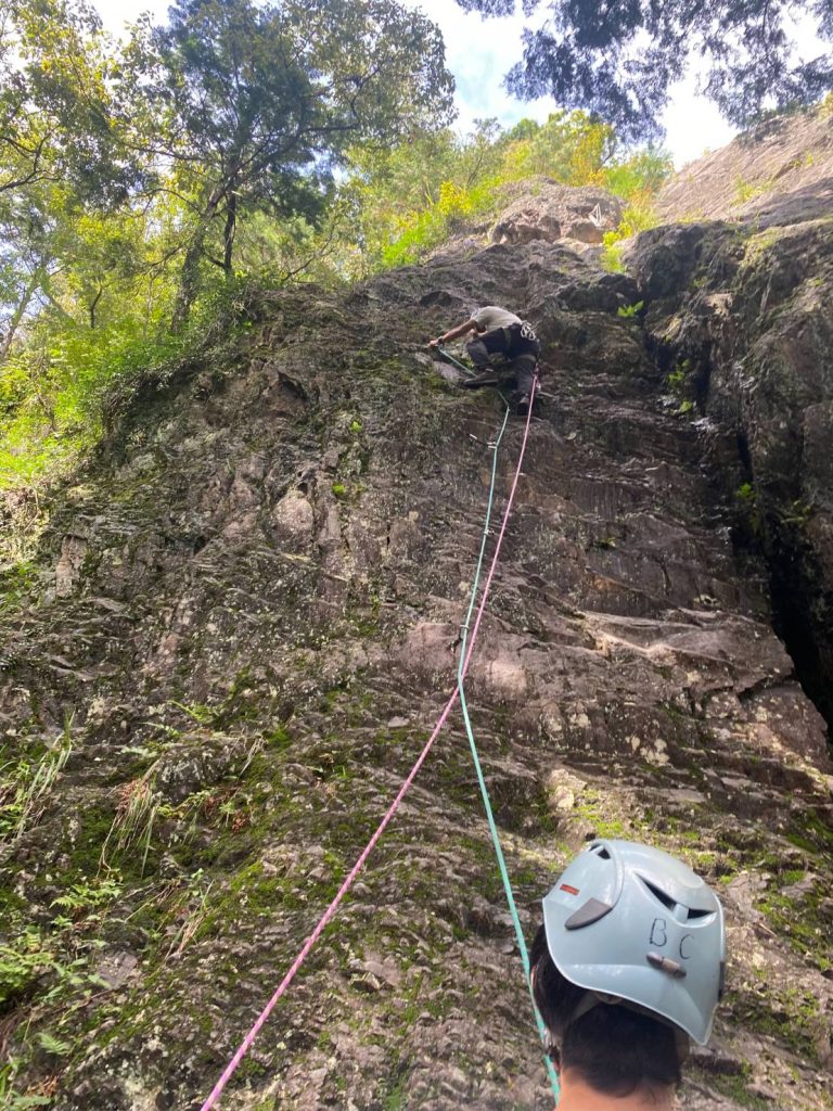 ある程度トップロープクライミングに慣れてきたら標準的な上り方のリードクライミングを学びました。リードクライミングはトップロープクライミングと比べて自分で中間支点にクイックドローをつけながら登る為、比較的難易度が高く危険です。参加者の一人が登っている最中クイックドローが2つ足りなくなるアクシデントがありましたが、下の既につけているクイックドローを回収て対応し、登り切りました。